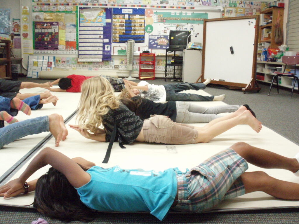 With the body resting on a firm surface, such as the floor, participants become learn from different qualities in pressure. The ability to sense differences in subtle pressures of the body against the floor is one way to develop the SB. The way children’s bodies rest on the floor gives them insight to how their body parts work in relationship with each other. The sensations of pressures mirror motor patterns, and are used as a type of “biofeedback” to help participants get a tangible experience of the “stories” in their bodies. Lying on the floor is also used to sense changes that happened inside the body, before and after a lesson.